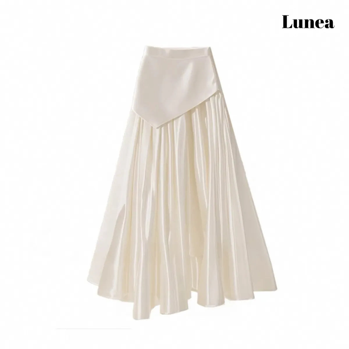 華やかなドレープが美しく揺れる、アシンメトリーデザインのフレアスカート。フロントの斜めカットが腰元をスタイリッシュに見せ、優雅なAラインシルエットを演出します。落ち感のある素材が動きに合わせて自然なニュアンスを加え、洗練された女性らしさを引き立てる一着です。